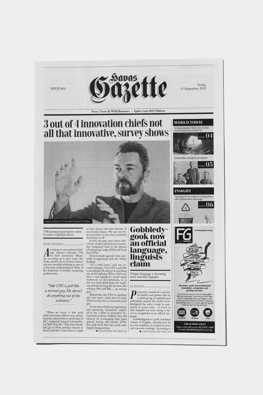 it felt like an ideal time to poke fun at ourselves, and so we created our very own satirical newspaper to go with a good cup of coffee at spikes asia festival 2016.